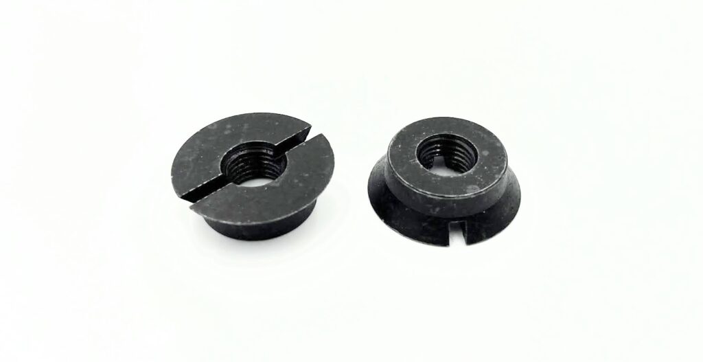 These custom slotted lock nuts were manufactured using 4140 alloy steel material heat treated to 28-32 HRC. A 5% taper on the shoulder was required which created some difficulties in modifying the cold heading equipment to meet the required tolerances. The outside diameter was set to 1.00″ and the tapered shoulder reaches 0.75″ at its minimum. Parts were run through black oxide process as the final step in the production process.