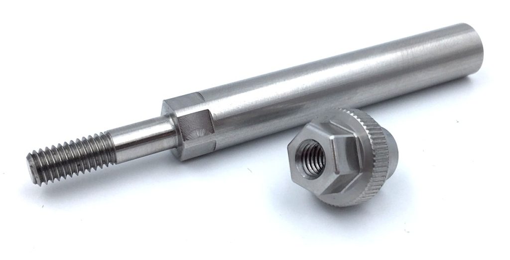 We had 100 pcs of this mating custom 316L machined hardware produced domestically with a lead time of approximately 4 weeks. These 100 pcs were to be used in testing prior to larger volume production. The rod pieces measures 90MM in overall length and the knurled nut measures 17MM in overall height. Getting the nut fully tapped turned out to be the trickier part of the process – the taps kept breaking before the full depth was reached. After a few adjustments and a change-up on the thread tap style used that last issue was finally resolved. Material certs were provided with the parts per customer’s original request.