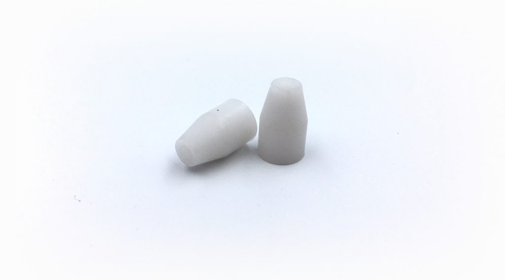 These are custom machined nylon pins we supply our industrial OEM customer. They are manufactured overseas with a lead time of approximately 120 days from approved drawing/print. Overall length is set at 1/2″ and the OD drops from 5/16″ on one side to 3/16″ on the other narrow side. The machined convex portion measures approximately 5/16 inches in length, leaving approximately 3/16 inches on the 5/16″ OD section. Plain acetal material was used without any dye. Annual revolving blanket purchase orders are used with monthly releases – estimated annual usage is at 60,000 pcs.
