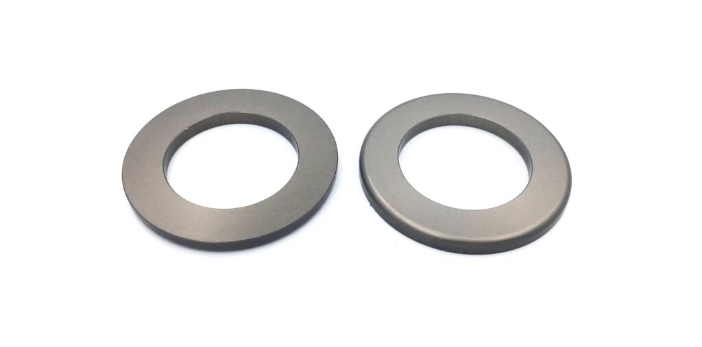 These custom precision machined washers were manufactured for our electronics customer using 6061-T651 aluminum material with a flash hard anodize finish. The ID was set to 1.015-1.005″ and OD at 1.625″. One of the corners required a R.062 machined radius and the washer thickness had to be between .125″ and .135″. Full certs were provided with the parts.